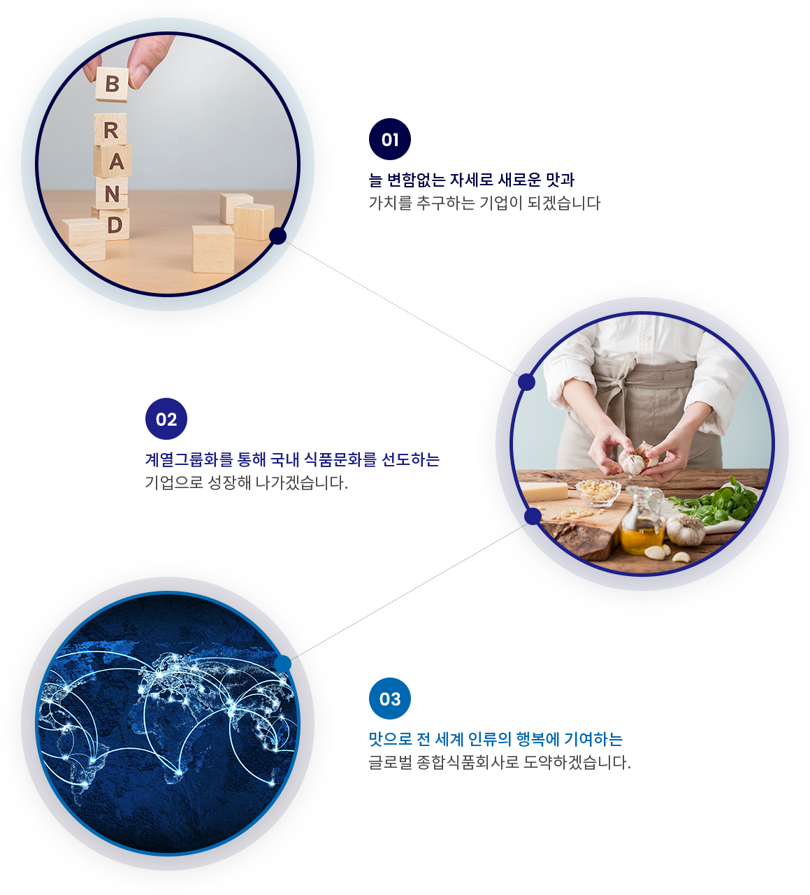 비전 재원푸드는 끊임없이 새로운 맛과 가치를 창출하여 국내 식품문화를 선도하고, 최종적으로 대한민국을 넘어 전세계 인류의 행복을 추구(기여)하는 글로벌 종합 식품으로 도약하고자 합니다.