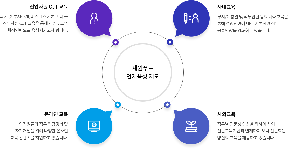 재원푸드는 당사 임직원들의 무한한 가능성을 실현할 수 있도록 체계적인 인재육성 제도를 통해 임직원의 전문성과 역량을 향상시키고자 합니다.